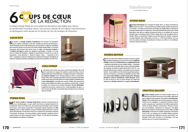 Backed by Rossana Orlandi since its founding in 2024, Craftica Gallery embodies the contemporary voice of the international creative scene. Objects and furniture curated by Martine Schaefer combine ecology and art design, function and emotion. In Milan, she presented an unprecedented installation where recycled paper objects met noble materials. The gallery showcases experimental, daring collections that captivated visitors and professional buyers. Craftica Gallery promotes a new generation of emerging designers committed to craftsmanship and sustainable design. In just two years, the young gallery has proved itself with its rigorous selection and impactful discourse. An unprecedented model combining aesthetic narrative with high standards, it has already made its mark internationally.