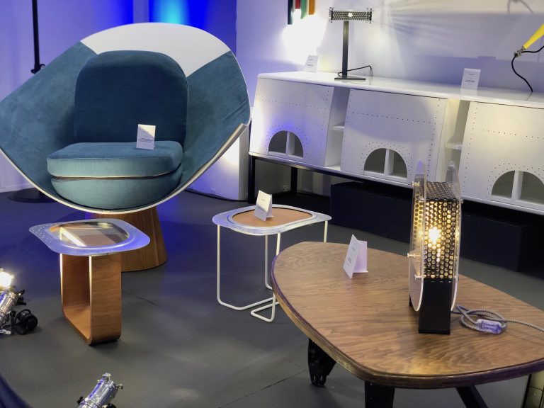 Pour cette première collection, « A Piece of Sky » a rassemblé un pool de designers et d’artisans qui pour 2019 a réuni onze talents. Chacun a travaillé à sa manière sur le projet, mais ils partagent tous des valeurs d’engagement propres à leur époque. Dans ce collectif on retrouve : Christelle Doutey, Bertrand Marc du site Lilou in the Wood, Fabien Puginier fondateur de Brut Design et Faustine Milard, l’ébéniste designer Jeremy Grondin, l’agence de design et d’architecture d’intérieure Prémices and Co, Flavie Thievenaz, Christian Grisinger et Erik Akopyan d’Initiatives Solidaires, acteurs de l’économie sociale et solidaire, et la manufacture de mobilier, Maximum Paris. Grâce à eux, douze pièces au design original ont vu le jour. Parmi elles, on découvre le fauteuil Radôme de Christelle Doutey, la coiffeuse intelligente de Bertrand Marc et Flavie Thievenaz, des petites tables basses signées Christelle Doutey, des bielles suspendues de Premices and Co, des étagères Premices and Co, réalisées par Jérémy Grondin, des étagères en carbone Aéronautique par Maximum Paris, des lampes Initiatives Solidaires, des tables signées Bertrand Marc, des chaises de Fabien Puginier, un buffet Flavie Thievenaz et Bertrand Marc, et pour finir, une série de lampes Bertrand Marc. Certaines pièces sont uniques, d’autres réalisables en série, mais il y a de quoi largement meubler plusieurs intérieurs. Cette démarche avant tout artistique est aussi une manière intelligente de revaloriser le patrimoine industriel d’Airbus et de s’inscrire dans une démarche d’économie circulaire, indispensable aujourd’hui. Une initiative qui permettra de réutiliser entre 5 et 10 avions en 2019, soit 2000 pièces, pour une livraison prévue en Janvier 2020.