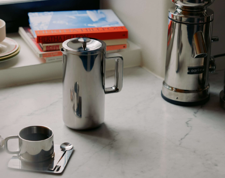 Aarke introduit également une cafetière à piston en acier inoxydable, conçue comme une alternative durable au verre. Sa double paroi isolante conserve la chaleur pendant trois heures, tandis que son filtre en maille fine assure une infusion sans dépôt, préservant les huiles naturelles du café. Compacte et résistante, elle se veut adaptée aussi bien à un usage domestique que nomade.