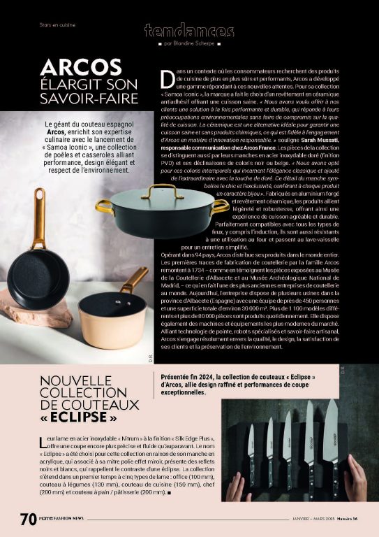 The pieces also stand out with their gold-finish stainless steel handles (PVD coating) and a choice of black or beige tones. « We selected these timeless colours that embody classic elegance and added an extraordinary touch with the gold accents. This handle detail symbolises chic exclusivity, giving each piece a jewellery-like character. » Made from forged aluminium with a ceramic coating, these products combine lightness and durability, ensuring a pleasant and long-lasting cooking experience. Fully compatible with all heat sources, including induction, they are also oven-safe and dishwasher-friendly, making maintenance effortless. Operating in 94 countries, Arcos distributes its products worldwide. The earliest traces of knife-making by the Arcos family date back to 1734, as evidenced by pieces displayed at the Albacete Cutlery Museum and the National Archaeological Museum in Madrid, making it one of the oldest cutlery manufacturers in the world. Today, the company operates several factories in the province of Albacete, Spain, with a team of nearly 450 employees and a total surface area of around 30,000 m². More than 1,100 different models and over 80,000 pieces are produced daily. It is also equipped with the most advanced machinery and equipment on the market. By combining state-of-the-art technology, specialised robotics, and artisanal expertise, the brand remains firmly committed to quality, design, customer satisfaction, and environmental preservation.