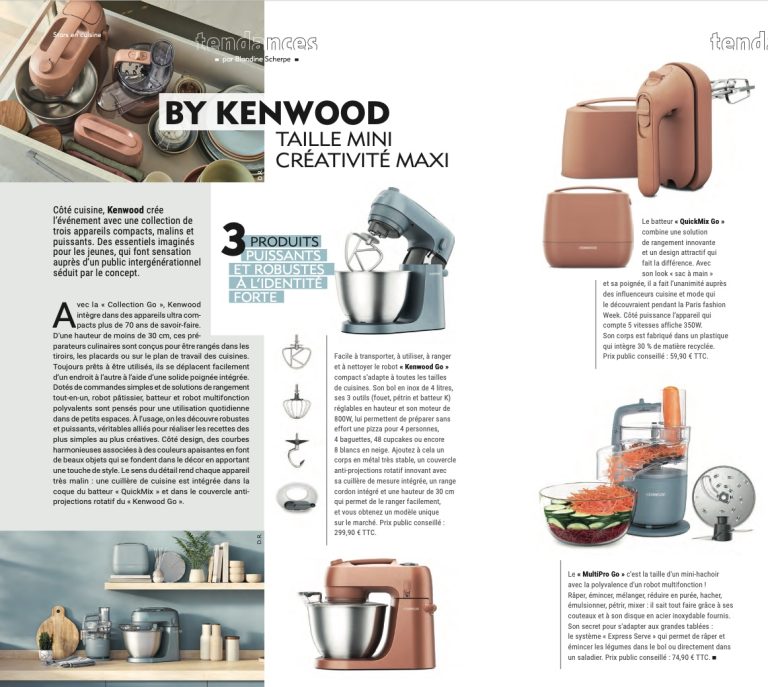 Avec la « Collection Go », Kenwood intègre dans des appareils ultra compacts plus de 70 ans de savoir-faire. D’une hauteur de moins de 30 cm, ces préparateurs culinaires sont conçus pour être rangés dans les tiroirs, les placards ou sur le plan de travail des cuisines. Toujours prêts à être utilisés, ils se déplacent facilement d’un endroit à l’autre à l’aide d’une solide poignée intégrée. Dotés de commandes simples et de solutions de rangement tout-en-un, robot pâtissier, batteur et robot multifonction polyvalents sont pensés pour une utilisation quotidienne dans de petits espaces. À l’usage, on les découvre robustes et puissants, véritables alliés pour réaliser les recettes des plus simples au plus créatives. Côté design, des courbes harmonieuses associées à des couleurs apaisantes en font de beaux objets qui se fondent dans le décor en apportant une touche de style. Le sens du détail rend chaque appareil très malin : une cuillère de cuisine est intégrée dans la coque du batteur « QuickMix » et dans le couvercle anti- projections rotatif du « Kenwood Go ».