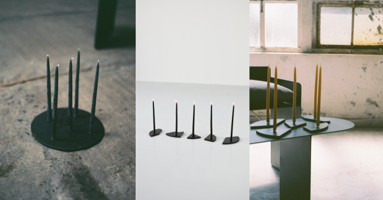 Candelabra se compose de cinq bougeoirs en fer forgé à la main, chacun en forme d’éclat. Dispersés ou assemblés en cercle, ils forment une pièce centrale graphique et narrative. Un jeu de modularité qui invite à composer sa lumière comme on composerait un poème silencieux. Ce contraste entre l’éphémère de la flamme et la solidité du métal donne au projet toute sa profondeur : « Nous voulions concevoir un objet indestructible, en écho à la fragilité du feu », précisent les designers. Chaque pièce est réalisée avec soin, dans le respect du geste artisanal, et pensée pour traverser le temps. Prix public indiqué 2025 : 115 € TTC