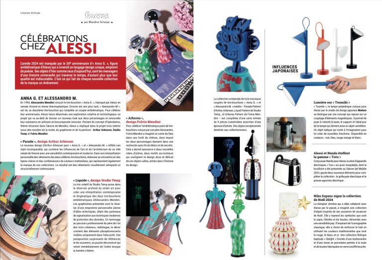L’année 2024 est marquée par le 30e anniversaire d’« Anna G. », figure emblématique d’Alessi qui a inventé un langage design unique, empreint de poésie. Ses objets d’hier comme ceux d’aujourd’hui, sont les messagers d’une histoire universelle qui traverse le temps, d’autant plus que leur qualité est indiscutable. C’est ce qui fait de chaque nouvelle collection de la marque un événement.