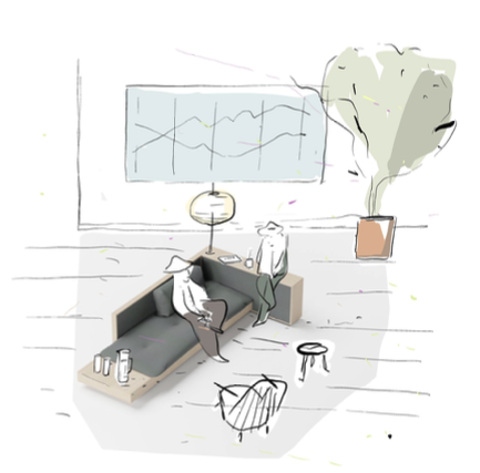 Un canapé où il est possible de s’assoir formellement ou de s’allonger, de se restaurer ou travailler.