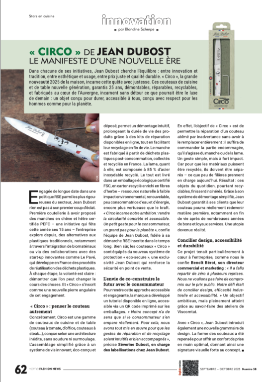 “Circo embodies our ambition: to make circularity concrete and accessible. A small gesture for the consumer, a giant step for the planet,” says the Jean Dubost team, faithful to its long-term CSR approach. Naturally, “Circo” knives also feature the new “eco-secure” protection system, a Jean Dubost exclusivity that enhances safety at the point of sale.