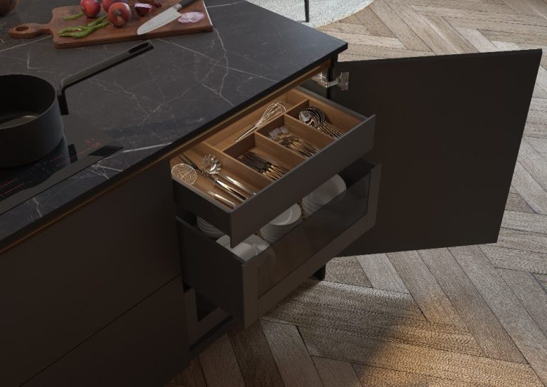 Parce qu’une cuisine de qualité se reconnaît aussi à ses finitions, « Lord Théodore » mise sur des détails discrets mais indispensables. Ses tiroirs silencieux dissimulés dans l’îlot central offrent une ouverture fluide et intuitive, rendant chaque geste plus agréable au quotidien.