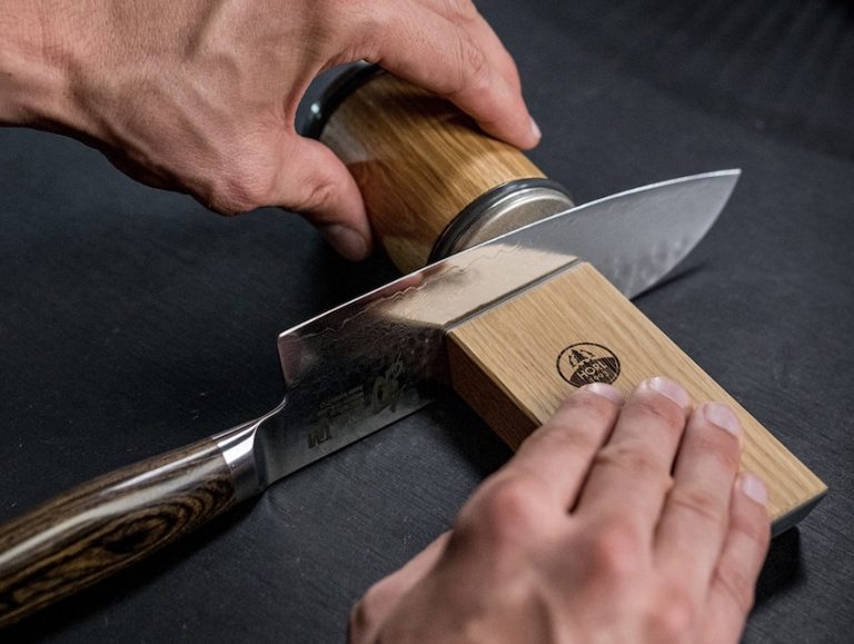 Si l’on souhaite aiguiser des couteaux de manière pratique, fiable et avec une sécurité élevée, il faut choisir l’aiguiseur de couteaux manuel. Le degré d’affûtage est généralement déjà préréglé. La plupart des couteliers en proposent à leurs clients. « Concernant les affûteurs manuels ou électriques, il y a toujours deux étapes : la première correspond à un affutage de la lame, c’est-à-dire lui redonner son biseau de coupe initial, de son talon à sa pointe, sur un V de coupe fabriqué avec du carbure de tungstène plus dur que l’acier, qui va enlever de la matière ; ensuite, pour retrouver le tranchant de la lame, il faut la passer dans la deuxième encoche dont le V de coupe est fabriqué en céramique », explique Séverine Dubost, responsable Web, digital et labels chez Jean Dubost.