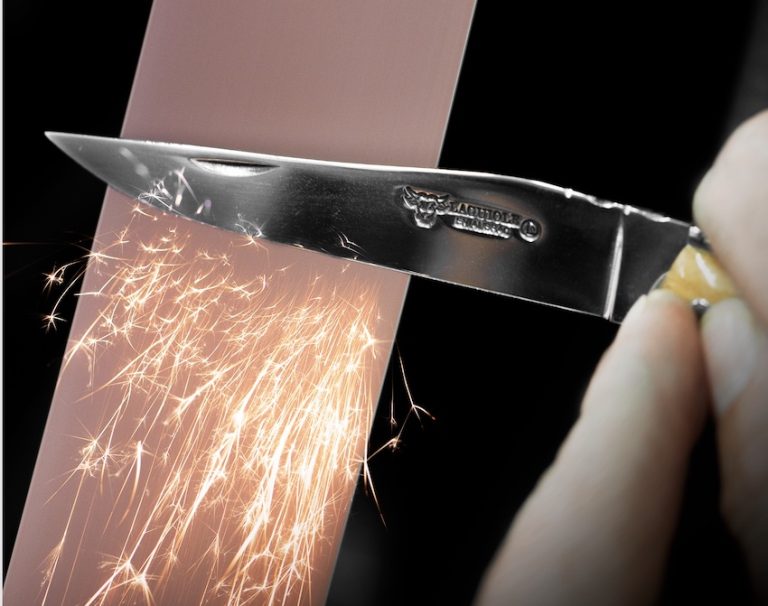 Pour Didier Perret, président de la manufacture Claude Dozorme, c’est le choix de la matière et l’émouture qui sont très importants pour la qualité de coupe : « Un couteau qui a un bon acier et une bonne émouture bien faite du haut en bas de la lame, diminue beaucoup le besoin d’affutage. L’acier de la lame lui confère un excellent tranchant, une bonne tenue du fil, ainsi qu’un réaffutage aisé. Seul l’affilage est à faire régulièrement en fonction de l’usage. Nous ne vendons pas beaucoup d’outils d’affûtage, si ce n’est dans certaines gammes, des fusils pour l’aiguisage des couteaux de cuisine. Dans nos gammes des « Laguiole », nous avons des services à découper de trois pièces comprenant le couteau, la fourchette et le fusil. Ces outils sont considérés comme des compléments de gammes. Nous ne proposons pas de pierres à aiguiser ». Elles se trouvent facilement chez les revendeurs, de même pour les outils à aiguiser.