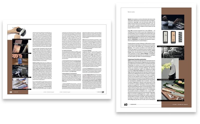 Chez Kaï, le service proposé est un peu différent : « Si l’affûtage de la lame s’avère un peu trop compliqué pour un consommateur, nous lui conseillons de se rendre chez un de nos clients partenaires en coutellerie, qui aura le savoir-faire pour parfaitement remettre en état la lame du couteau, explique Nicolas Guinebretière. En revanche, tous les couteaux de la gamme « Michel Bras » sont aiguisés directement au Japon ; l’envoi est gratuit pour le consommateur ».