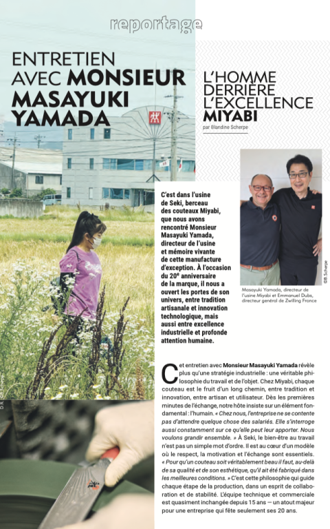 C’est dans l’usine de Seki, berceau des couteaux Miyabi, que nous avons rencontré Monsieur Masayuki Yamada, directeur de l’usine et mémoire vivante de cette manufacture d’exception. À l’occasion du 20ᵉ anniversaire de la marque, il nous a ouvert les portes de son univers, entre tradition artisanale et innovation technologique, mais aussi entre excellence industrielle et profonde attention humaine.