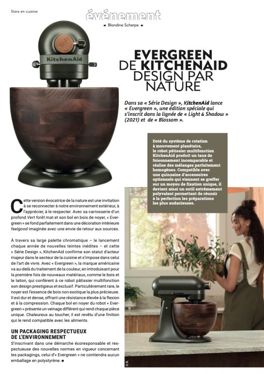 À travers sa large palette chromatique – le lancement chaque année de nouvelles teintes inédites – et cette « Série Design », KitchenAid confirme son statut d’acteur majeur dans le secteur de la cuisine et s’impose dans celui de l’art de vivre. Avec « Evergreen », la marque américaine va au-delà du traitement de la couleur, en introduisant pour la première fois de nouveaux matériaux, comme le bois et le laiton, qui confèrent à ce robot pâtissier multifonction son design prestigieux et exclusif. Particulièrement rare, le noyer est l’essence de bois non exotique la plus précieuse. Il est dur et dense, offrant une résistance élevée à la flexion et à la compression. Chaque bol en noyer du robot « Evergreen » présente un veinage différent qui rend chaque pièce unique. Chaleureux au toucher, il est revêtu d’une finition qui le rend compatible avec les aliments.