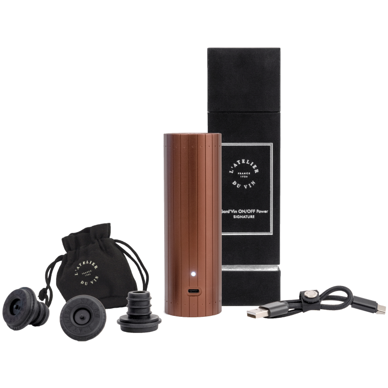 Comme la pompe manuelle « Gard’Vin On/Off », la nouvelle version « Power » est une pompe à vide, saluée par des professionnels du vin – œnologues et sommeliers – qui permet de prolonger la durée de vie et la fenêtre de dégustation de vins précieux, après leur ouver-ture. Grâce à son fonctionnement électrique, elle permet de plus, une mise sous vide encore plus efficace et précise. L’absorption de l’air qui se fait automatiquement, est indiquée par un signal sonore et par une lumière LED blanche qui indique la progression de l’opération. Une fois le vide d’air obtenu, son moteur se coupe de lui-même. Côté design, son corps en ABS a été travaillé de telle façon à rappeler les pressoirs en bois, qui symbolisent le monde du vin. Très actuel, son coloris Noir mat souligne le caractère technologique de cet outil chaleureux et instinctif, qui porte le sceau de L’ Atelier du Vin, embossé sur le disque métallique supérieur. Naturellement livré avec un cordon de charge, le « Gard’Vin On/Off Power », est présenté en coffret, avec trois bouchons techniques à valve et mémoire de date de mise sous vide. Dans sa version luxe en fonte d’aluminium – « Gard’Vin On/Off Power – Signature » – le produit et ses accessoires se découvrent dans un élégant écrin qui évoque les plus beaux coffrets de parfum. La pompe parée d’un superbe marron, inspiré des pressoirs, y est protégée par une bourse en tissu noir.