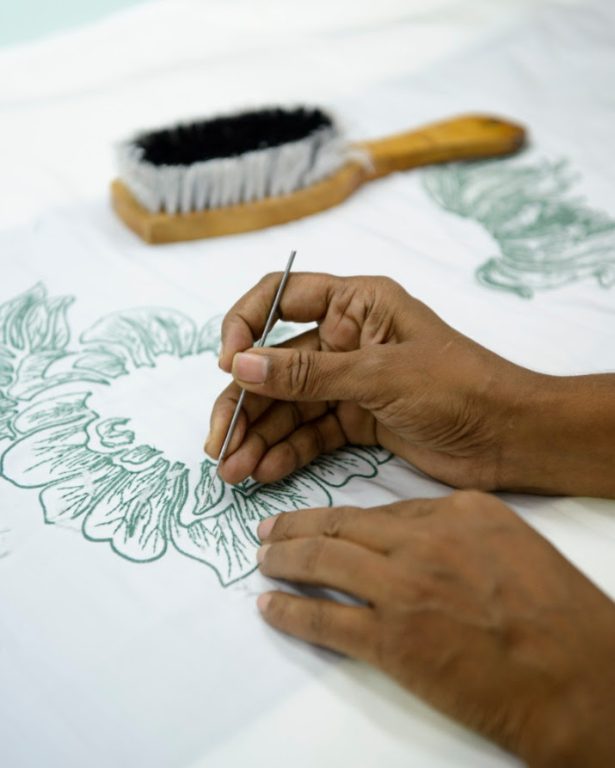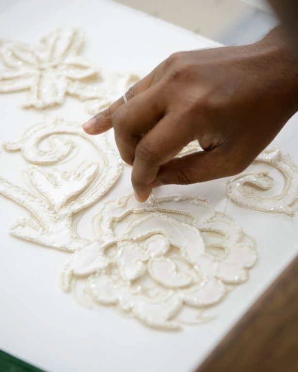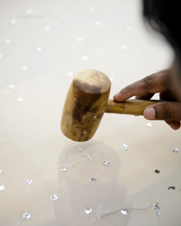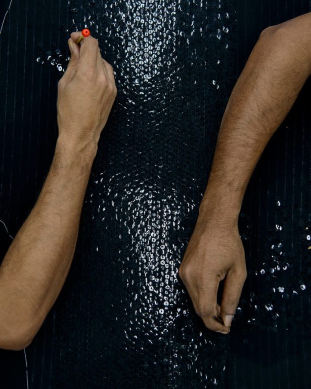 Tandis qu’il y a deux ans, avec le projet Battiti, l’attention était portée sur les céramiques artistiques de Bottega Gatti, Foscarini s’aventure ici en d’autres terrains : ceux de la haute couture et de la broderie du Amal, qui crée des décorations raffinées et souvent audacieuses sur des vêtements, en Inde et à Rome.