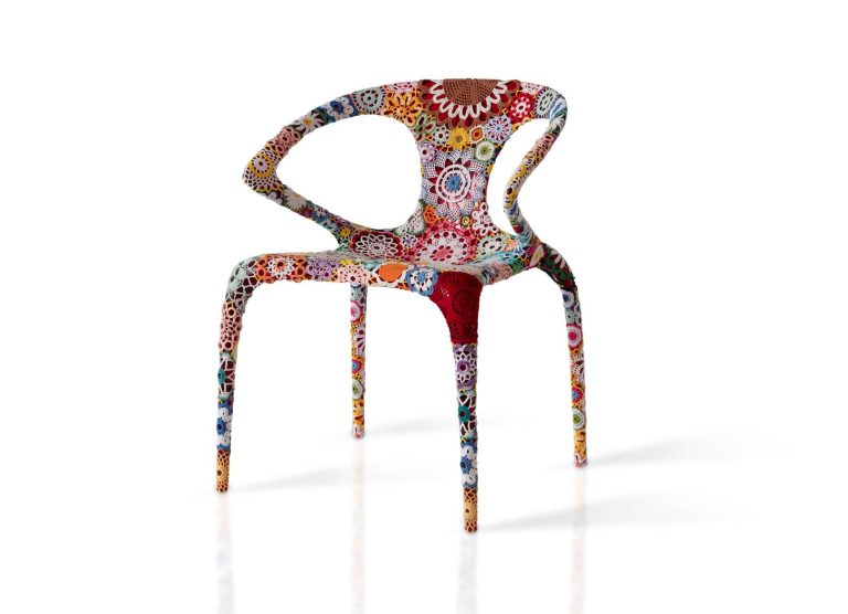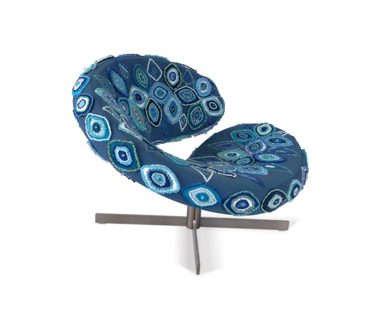 Joana Vasconcelos s’est appropriée en toute liberté des modèles édités par Roche Bobois, les a réinterprétés en respectant l’essence de chacun mais en y inscrivant son identité et ses propres codes artistiques. Sa créativité sans pareil, qui met à l’honneur les traditions artisanales et les savoir-faire portugais, redéfinit les codes de l’art contemporain. L’ensemble des œuvres revisitées – deux chaises « AVA », les fauteuils « Lady B » et « Nuage », les tables basses « Sismic » et « Cute » ainsi qu’une composition de l’iconique « Mah Jong » – ont été exposées et scénographiées, au printemps dernier, au sein même de l’atelier lisboète de l’artiste dans le cadre de la foire d’art contemporain ARCO. Depuis, et jusqu’au mois de décembre prochain, l’exposition voyage à travers l’Europe et outre-Atlantique. Après une dernière présentation à l’occasion d’Art Basel (Miami Beach, 5-8 décembre 2019), les œuvres seront vendues aux enchères. L’intégralité des fonds récoltés seront reversés à la fondation Joana Vasconcelos, un organisme caritatif dont l’objectif est de promouvoir et de développer l’art via des projets éducatifs. S’exprimant sur cette collaboration Gilles Bonan, président du directoire Roche Bobois, a souligné son caractère exceptionnel : « Roche Bobois est particulièrement fier de s’associer aux talents multiples de Joana Vasconcelos. Son audace artistique, ses fulgurances créatives et la poésie qui en émane donne une nouvelle grille de lecture à nos créations, qu’elle détourne et réinterprète avec brio. En associant création artistique, design et savoir-faire artisanal, cette collaboration exprime des valeurs centrales de Roche Bobois. »