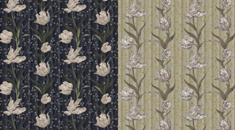 Pour le papier peint, le motif Tulipes s’imagine en frise sur un fond de rayure. Il s’agit d’un papier peint à motif répétitif : le panneau est raccordable à l’infini. Il est proposé dans trois variantes de couleurs.