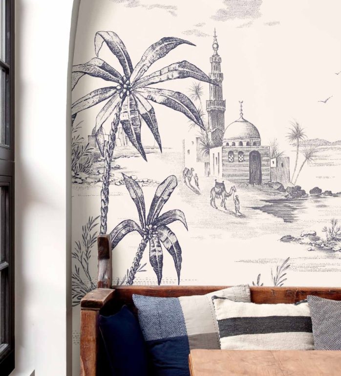 Les Tulipes monochromes s’imaginent en frise sur un fond de rayure pour des papiers peints de différentes couleurs. La fresque orientale, felouque, palais, palmiers, oiseaux exotiques se déploie en panoramique, autre prouesse permise par le savoir-faire d’Isidore Leroy. Une jolie alliance pour ce premier chapitre à quatre mains.