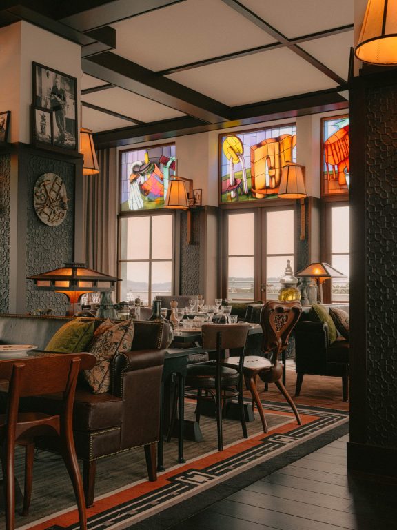 Sous ses toits, la Maison de Manfred accueille le décor d’une salle à manger à l’esprit familial élégant et accueillant, grâce au mobilier en bois et cuirs naturels, aux lumières chaudes et diffuses. Les colonnes centrales s’habillent d’un cuir gaufré vert texturé ; les murs se réchauffent de carreaux de terres cuites et de piles de rondins. Partout, des photos souvenirs, souvenirs de l’histoire d’un lieu qui a toujours existé.Pour cet espace unique, l’artiste multidisciplinaire Ara Starck a créé dix-neuf vitraux, dont un monumental qui fait rayonner une lumière cathédrale colorée autant dans la salle principale du restaurant que sur la ville de Metz.