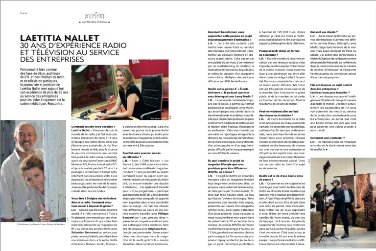 Personnalité bien connue des fans de déco, auditeurs de RTL et des chaînes de radio et de télévision publiques, la journaliste et productrice Laetitia Nallet met aujourd’hui son expérience de plus de 30 ans au service des entreprises pour les aider à rayonner sur la scène médiatique. Rencontre.