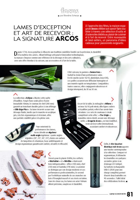 À l’approche des fêtes, la maison espagnole Arcos célèbre son savoir-faire coutelier à travers une sélection d’outils et d’ustensiles dédiés au plaisir de cuisiner et à l’art de recevoir. Entre nouveautés et best-sellers, un panorama d’idées cadeaux pour passionnés exigeants.
