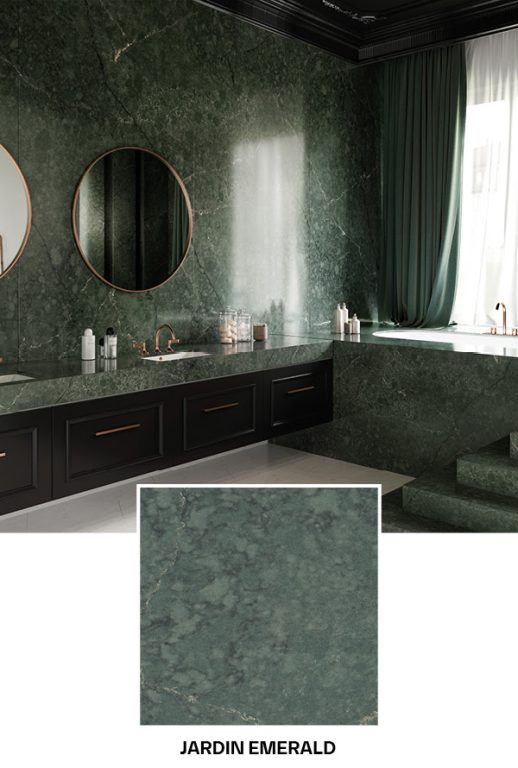 Grâce à son motif raffiné de veines dorées et sa palette de couleurs apaisantes, Jardin Emerald réinvente la beauté naturelle des marbres verts exclusifs, en créant une finition graphique élégante pour un effet haut-de-gamme assuré.
