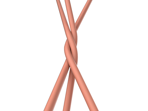 Les trois mâts en acier ronds sont entrelacés dans une étreinte inspirée de la nature. La silhouette s’apparente à un faisceau de branches organiques enroulées les unes aux autres, créant un volume robuste à l’équilibre parfait et un design totémique impactant.