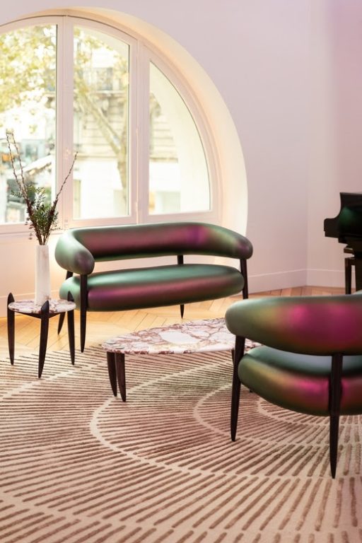 Le canapé et le fauteuil de la collection reposent sur des piètements dont les formes évoquent les dents du morse, apportant une touche sculpturale à l’ensemble. Ces pièces se démarquent par leurs assises en néoprène iridescent dont la surface lisse et brillante, sans couture, rappelle la peau soyeuse de l’animal marin..