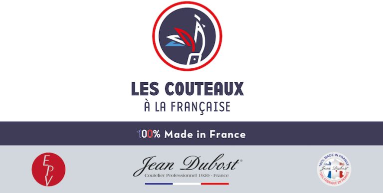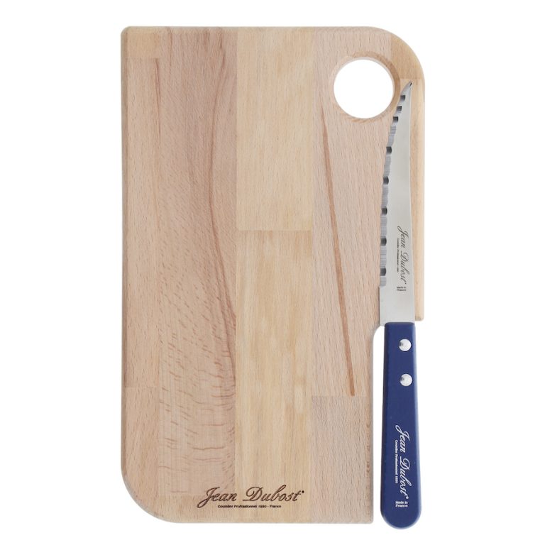 Les manches en bois de hêtre cérusé bleu, naturel ou rouge, marqué du logo Jean Dubost donnent une grande élégance à la collection de ces couteaux à la lame demi-soie et aux rivets en acier inoxydable. 100% conçue et fabriquée en France dans les ateliers Jean Dubost, près de Thiers cette collection représente en outre, la préservation de savoir-faire traditionnels et de l’emploi local préservé. Couteau d’office, éplucheur, couteau steak, couteau légumes, couteau tomate, couteau d’office bec d’oiseau, tartineur, couteau chef, couteau de cuisine classique, couteau à pain… pour chaque usage un couteau vendu sur carte en carton mais également disponible avec différents modèles de planches à découper à aimant (pour le maintien du couteau). De 3,40 € TTC pour un éplucheur « Tradition » à 52 € TTC pour le set planche pain + couteau à pain (prix de vente public conseillé) les articles ont un prix accessible qui permet à tout un chacun de s’offrir du « Made in France« .