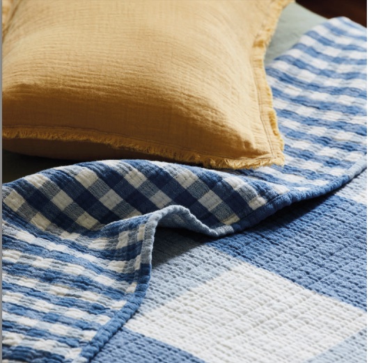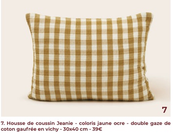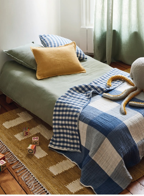 Hymne à la fraîcheur et à la simplicité, où les tons pastels se mêlent harmonieusement à des textures irrésistiblement douces. Imaginez la fluidité d’une gaze de coton qui danse doucement au rythme d’une brise légère, des coussins et des plaids en carreaux vichy qui évoquent la nostalgie des pique-niques sous le soleil, et des coussins ludiques pour lire ensemble leurs histoires préférées.