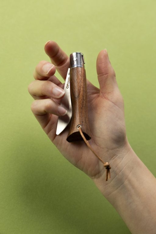 Il se distingue par ailleurs par son design soignée : un manche en bois noble avec vernis protecteur (ébène, noyer noir, olivier), une lanière en cuir naturel pour l’accrocher facilement, un rivet traversant en acier inoxydable, la ciselure de la bague « Opiflex ».