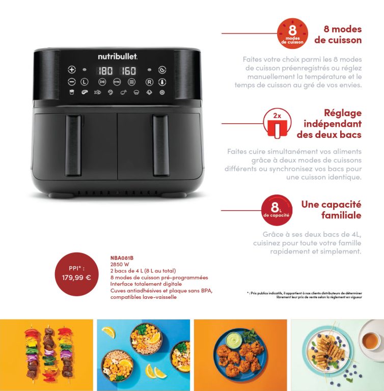 L’appareil offre la possibilité de se lancer dans des combinaisons quasi-infinies de repas complets. Doté de deux bacs indépendants de 4 litres, il permet de rôtir, cuire ou déshydrater simultanément, le tout au service d’une cuisine plus saine, plus rapide et plus économique.