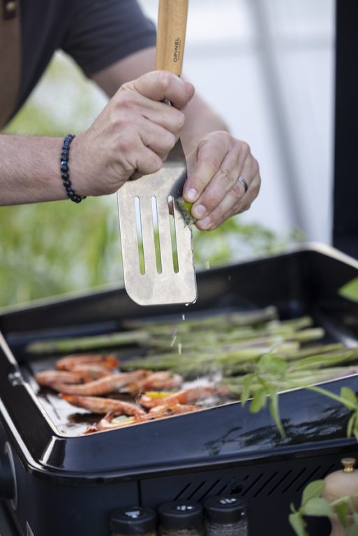 « Spatule+ » et d’une « pince XL ». Les éléments en acier inoxydable, de très haute qualité, sont associés à un manche traditionnel en bois de hêtre français, vernis, ce qui rend les pièces robustes, résistantes à l’humidité et aux tâches, et compatibles au lave-vaisselle.