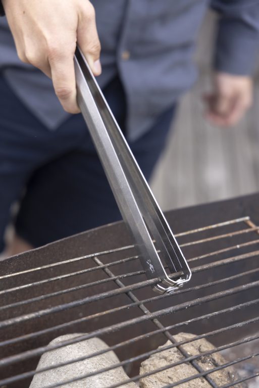 comme la spatule), sa longueur de 40 cm, la rend particulièrement intéressante pour une manipulation facile et sécurisée loin du feu. Sa tête asymétrique avec angle large cranté, permet d’agripper les grosses pièces ; l’angle étroit est prévu pour saisir les petits morceaux. Conçue de façon ingénieuse, elle comprend au talon une fente qui sert de solide lève-grille.