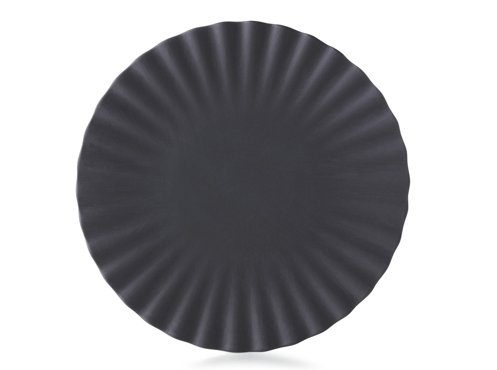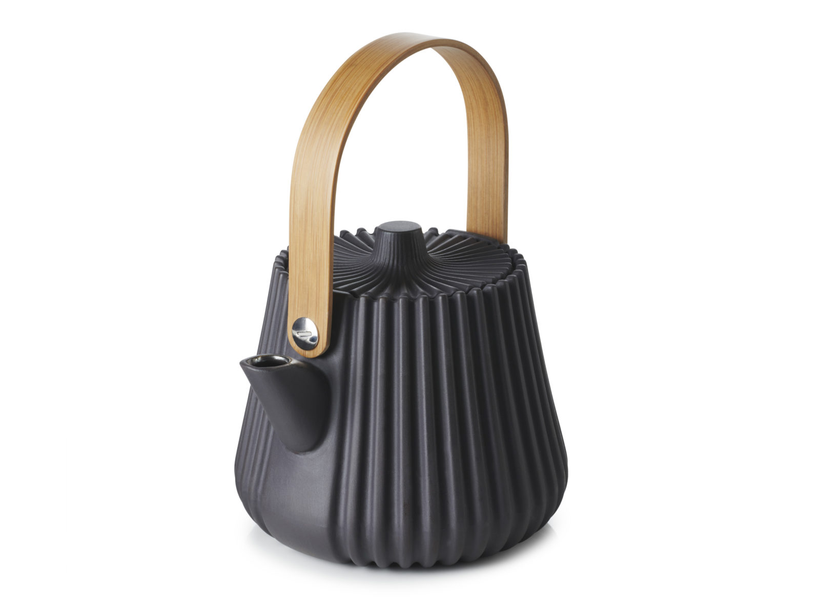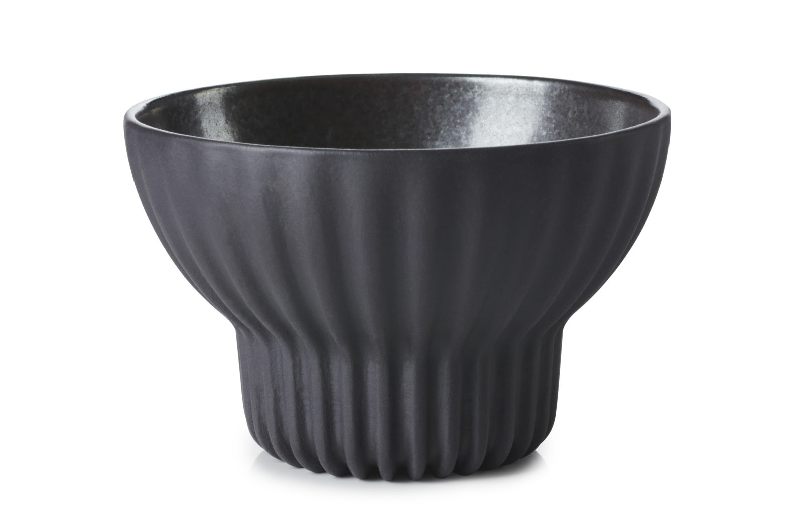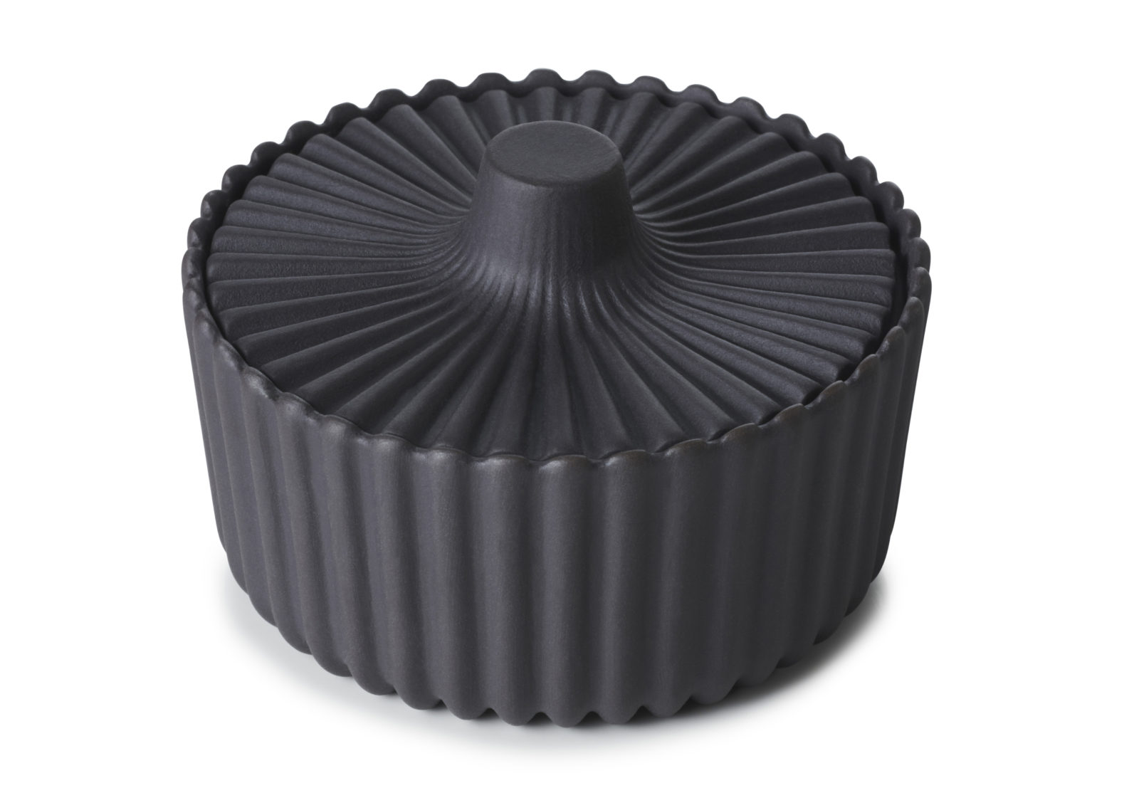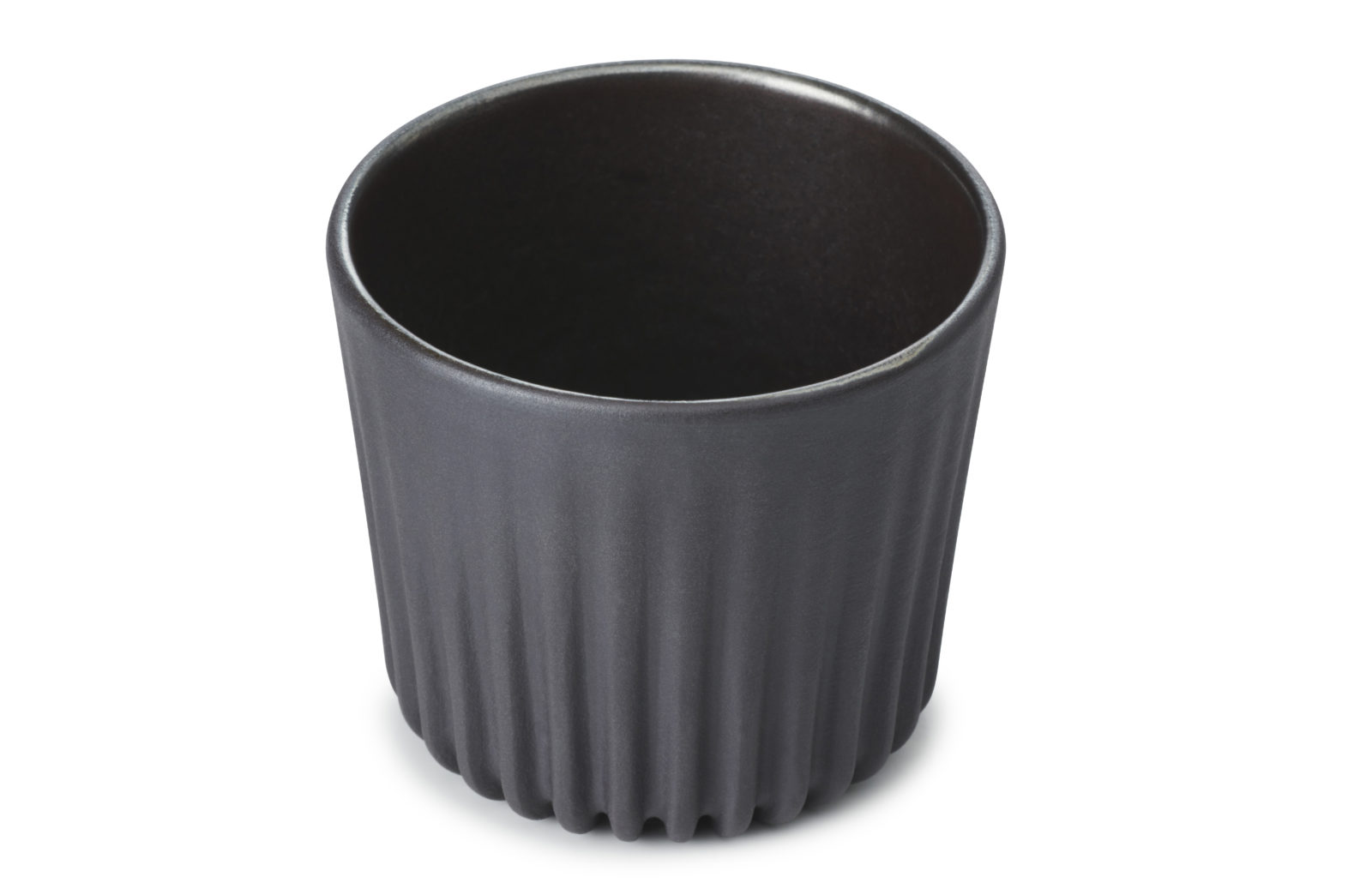 Jugs, sugar and other bowls, plates, teapots and bamboo trays were introduced alongside the original cups to create the ideal vessels for teatimes inspired as much by the gourmet aesthetics of French tea-drinking as by the pure lines of Asian tradition. Decisively functional, the fin motif – a heat dissipator inspired by the fans of LED lamps – allows you to hold this handleless cup at the same time as vouching for its complete stability on the saucer on which it sits so perfectly. Treated with an aged-silver or dark-metal enamel on the inside, the cup conserves its exterior of raw black paste but this is polished to give a soft, sensual feel when held in the hand.
