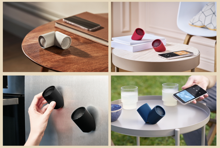 Ce duo d’enceintes portables Bluetooth affiche un design multi-position unique. Aimantées, elles s’utilisent de plusieurs façons : attachées l’une à l’autre, détachées, et même fixées sur une surface métallique.