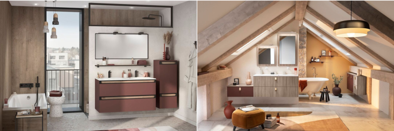 Avec ses lignes Unique et Delphy, Delpha développe une approche de l’aménagement de la salle de bain où l’esthétique se conjugue à la modularité et au confort d’usage. Les façades et finitions se déclinent dans une palette chromatique étendue, des rouges profonds aux accents terracotta, jusqu’aux tonalités inspirées du végétal, dessinant des univers à la fois contemporains et enveloppants. Le jeu des matériaux bruts et des couleurs permet de composer des configurations sur mesure, tandis que la lumière participe pleinement à la mise en valeur des volumes et des textures. L’introduction de bois structurés, comme le noyer clair, apporte une dimension organique qui dialogue avec des teintes plus sobres. Par cette diversité de nuances et de matières, l’enseigne affirme une vision de la salle de bain pensée comme un espace de vie à part entière, fonctionnel mais aussi expressif, où la scénographie intérieure prend tout son sens.