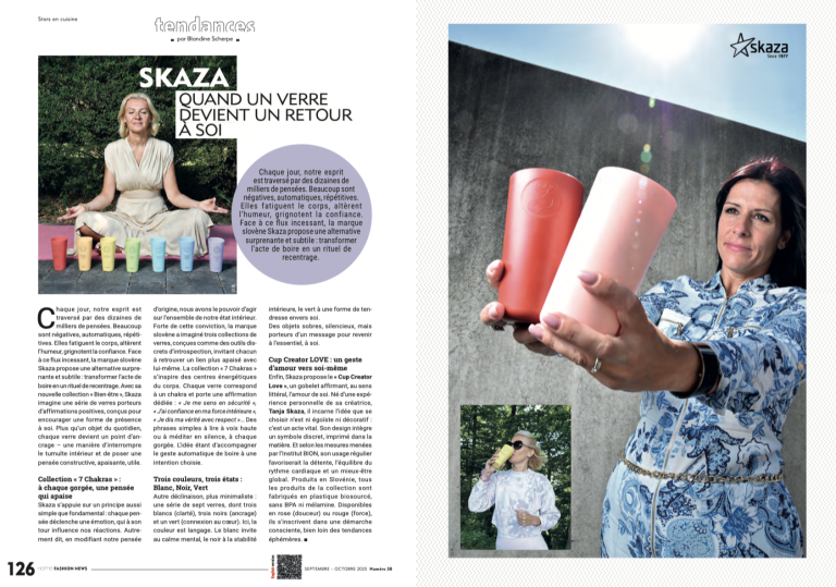 Enfin, Skaza propose le Cup Creator Love, un gobelet affirmant, au sens littéral, l’amour de soi. Né d’une expérience personnelle de sa créatrice, Tanja Skaza, il incarne l’idée qu’un geste quotidien aussi simple que celui de boire peut devenir un acte de soin. Conçu dans un matériau biosourcé, et mesuré selon les normes de l’Institut BION, ce verre favorise la détente, l’équilibre et l’harmonie intérieure dans un mieux-être global. Produits en Slovénie, tous les modèles Skaza conjuguent engagement écologique et bien-être personnel. Ils s’inscrivent durablement dans une dimension bien plus large que les tendances éphémères.