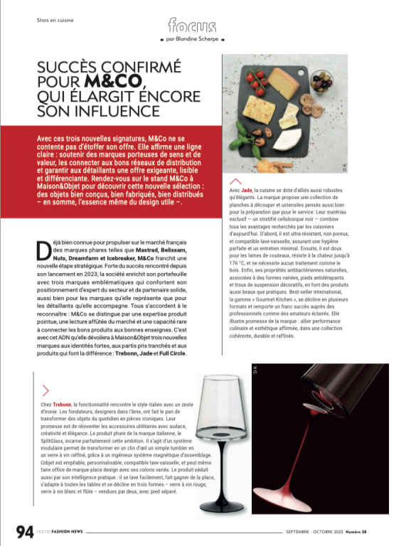 Déjà bien connue pour propulser sur le marché français des marques phares telles que Mastrad, Belissam, Nuts, Dreamfarm et Icebreaker, M&Co franchit une nouvelle étape stratégique. Forte du succès rencontré depuis son lancement en 2023, la société enrichit son portefeuille avec trois marques emblématiques qui confortent son positionnement d’expert du secteur et de partenaire solide, aussi bien pour les marques qu’elle représente que pour les détaillants qu’elle accompagne. Tous s’accordent à le reconnaître : M&Co se distingue par une expertise produit pointue, une lecture affûtée du marché et une capacité rare à connecter les bons produits aux bonnes enseignes. C’est avec cet ADN qu’elle dévoilera à Maison&Objet trois nouvelles marques aux identités fortes, aux partis pris tranchés et aux produits qui font la différence : Trebon, Jade et Full Circle.