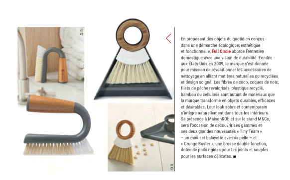 En proposant des objets du quotidien conçus dans une démarche écologique, esthétique et fonctionnelle, Full Circle aborde l’entretien domestique avec une vision de durabilité. Fondée aux États-Unis en 2009, la marque s’est donnée pour mission de révolutionner les accessoires de nettoyage en alliant matières naturelles ou recyclées et design soigné. Les fibres de coco, coques de noix, filets de pêche revalorisés, plastique recyclé, bambou ou cellulose sont autant de matériaux que la marque transforme en objets durables, efficaces et désirables. Leur look sobre et contemporain s’intègre naturellement dans tous les intérieurs. Sa présence à Maison&Objet sur le stand M&Co, sera l’occasion de découvrir ses gammes et ses deux grandes nouveautés « Tiny Team » — un mini set balayette avec sa pelle — et « Grunge Buster », une brosse double fonction, dotée de poils rigides pour les joints et souples pour les surfaces délicates.