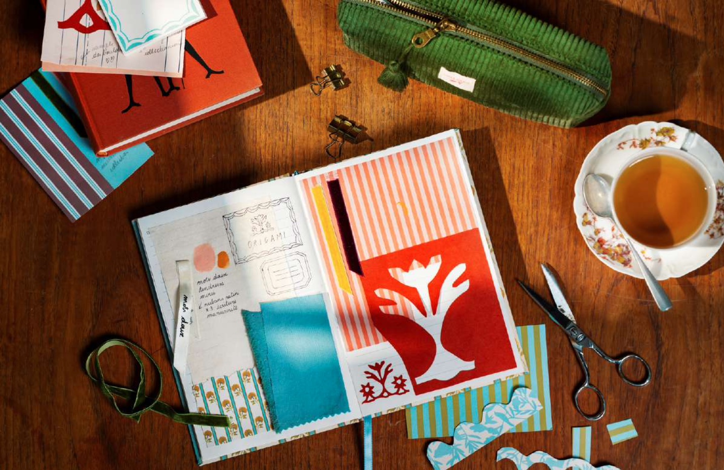 Commence alors une étroite collaboration qui passe d’abord par l’imagination. Artiste touche-à-tout, Laura Giraud imagine sa collection comme elle ouvrirait un tiroir à belles histoires, rempli de papiers, de tissus, de boutons et de toutes les merveilles qui accompagnent notre quotidien. Collectionneuse dans l’âme et amoureuse des belles matières, elle construit sa gamme d’accessoires et de papeterie à l’image d’un cabinet de curiosité, rassemblant nuances d’hier et objets précieux d’aujourd’hui.
