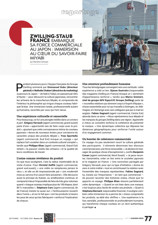 For several days, the French team of the Zwilling Group, led by Emmanuel Dubs (General Manager) and Nathalie Chabert (Marketing Director), traveled across Japan — from Seki to Tokyo, via Gifu and Kyoto — to discover Japanese culture, meet the artisans of the Miyabi factory, and gain first-hand insight into the philosophy that guides each knife crafted there. A total immersion, both professional and human, told by those who experienced it.